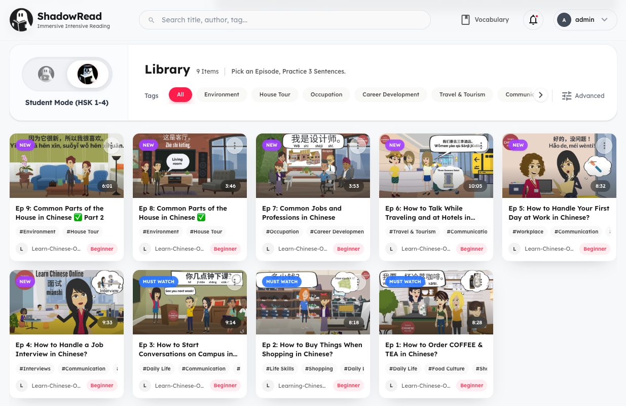 Guided comprehensible input. Master daily vocabulary through real-world scenarios tailored for HSK 1-4, minus the textbook.